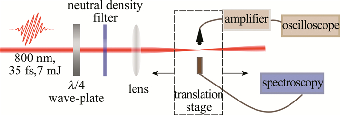 實驗裝置如圖 1所示,以獲得飛秒激光成絲過程中的熒光輻射光譜和聲音信號。實驗中采用的飛秒激光器型號為Astrella(Coherent, Inc.),該系統可輸出中心波長為800 nm、脈沖時間寬度為35 fs、單脈沖較大能量為7 mJ、重復頻率為1 Hz~1000 Hz可調的線偏振激光脈沖。激光器發射出的重復頻率為1000 Hz的激光經過λ/4波片、中性密度濾光片后,被焦距為40 cm的透鏡聚焦,在空氣中產生光絲。在光絲的垂直方向上由光纖將熒光信號引入光譜儀,測量光絲的熒光光譜。光譜儀型號為USB4000(Ocean Optics, Inc.),光譜每次測量的積分時間為1.5 s,平均次數為5次。控制電動位移臺使組裝在其上面的光纖探頭沿激光傳播方向移動,以獲得等離子體光絲不同位置處的熒光信號。轉動波片控制激光的偏振態實現由線偏振到圓偏振的演化。調節中性密度濾光片可連續改變激光脈沖能量,以獲得不同激光脈沖能量下的熒光信號。測量過程中以熒光信號出現的位置為等離子體光絲傳輸的零點,位移臺每移動1 mm收集一次信號,直至熒光信號消失。