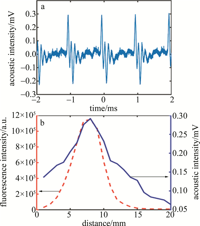 a—acoustic signal    b—intensity of fluorescence signal and acoustic signal & propagation distance