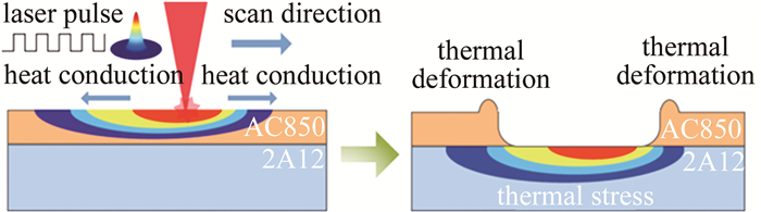 熱應(yīng)力耦合分析可以反映熱溫度場(chǎng)和應(yīng)力場(chǎng)的相互影響過(guò)程,根據(jù)求解步驟的不同, 分為直接求解法和間接求解法。直接求解法是利用包含溫度以及位移自由度的耦合單元,經(jīng)過(guò)一次求解計(jì)算同時(shí)得到熱分析和結(jié)構(gòu)應(yīng)力分析結(jié)果。間接求解法則需要分步進(jìn)行,首先通過(guò)熱分析計(jì)算出模型的節(jié)點(diǎn)溫度,將求解的節(jié)點(diǎn)溫度作為體載荷施加到結(jié)構(gòu)應(yīng)力分析中,求解出節(jié)點(diǎn)應(yīng)力。由于直接求解法的平衡狀態(tài)需要同時(shí)滿足多個(gè)準(zhǔn)則,復(fù)雜的約束條件使得節(jié)點(diǎn)自由度較多,并且矩陣方程繁雜,求解效率低。在鋁合金化銑保護(hù)膠激光刻型熱應(yīng)力耦合分析中,相較于結(jié)構(gòu)響應(yīng),熱分析的溫度對(duì)結(jié)構(gòu)分析時(shí)應(yīng)力應(yīng)變的影響更為顯著,因此本文中選擇效率較高的間接求解法來(lái)實(shí)現(xiàn)對(duì)鋁合金化銑保護(hù)膠激光刻型的熱應(yīng)力耦合分析。脈沖激光的刻蝕原理如圖 1所示,采用移動(dòng)高斯熱源模擬長(zhǎng)脈沖激光與目標(biāo)材料的相互作用過(guò)程。