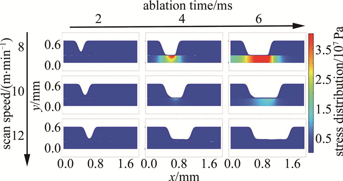 圖 3是以激光掃描速率為變量的仿真結(jié)果。分別選取8 m/min, 10 m/min, 12 m/min為參數(shù)節(jié)點(diǎn),其余仿真條件如下:激光功率為60 W、重復(fù)頻率為100 kHz。燒蝕時(shí)間節(jié)點(diǎn)選擇與圖例設(shè)置同圖 2。橫向觀察發(fā)現(xiàn),較10 m/min, 12 m/min的仿真結(jié)果,激光掃描速率為8 m/min時(shí),其燒蝕深度較深,且整個(gè)燒蝕過(guò)程中產(chǎn)生的應(yīng)力區(qū)域較大、應(yīng)力值較高,而燒蝕深度、應(yīng)力區(qū)域和應(yīng)力極值均與掃描速率呈負(fù)相關(guān)。因?yàn)閽呙杷俾实脑龃髸?huì)造成激光燒蝕過(guò)程中脈沖重疊率的減小,從而降低了激光加工過(guò)程中的熱效應(yīng)累積,同時(shí)也減少了熱應(yīng)力的集中現(xiàn)象。